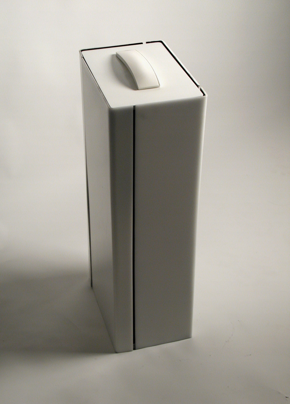 The packaging design was loosely based around the form of the subtle curves of the remote – however the project did not restrict the packaging to being exclusively designed to contain the remote, although it did. The notion of sustainability and the life cycle analysis of packaging was considered as an important component of the design development phase. In this case I chose to consider the re-use of the package as the method through which to avoid its disposal. It is a wooden box made from recycled chip board and steam bent wood. The top surface is in inlaid with magnets and a metal track and wrapped with a black leather that would contain a logo and other information. This box is one of my favorite designs.