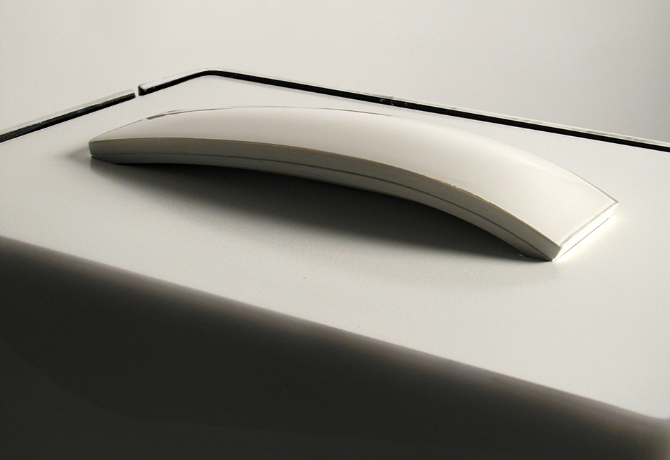 The remote design was to be fabricated with recycled glass slumped glass into a ceramic mold. The top side being the smooth glass touch surface – and the underside,’the belly’ – made with a hardened plastic to contain the components. The underside would then be sheathed in a soft white leather, a contrast that would compliment the glass on top. I still have the model, it is beautifully crafted and highly polished. I will add more imagery of the remote in hand, and the development drawings when I return to NZ.