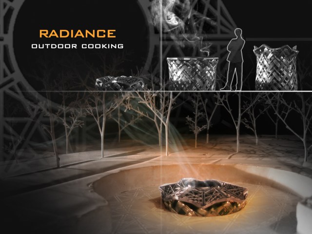 With this system of living comes a new products that influences the way we live and the architecture that is below us. Radiance is an outdoor cooker and a low lying campfire that has been implanted into the ground. It slowly changes between each form depending on the time of day. It draws energy from the sun, and harnesses it within it’s central core. The concept is to provide a product which allows for the sharing of resources and can accommodate a variety of group sizes.