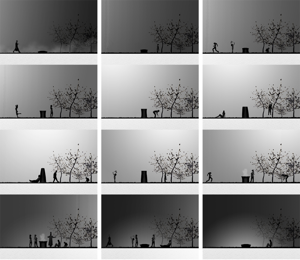 Slowly as the sun rises, radiance emerges from the ground. Growing upwards throughout the day it becomes part of the landscape as it quietly collects solar energy from the sun. Radiance stretches to its tallest point when the sun is at its highest in the sky. When fully charged, it slowly begins to descend. When ready for use the Radiance will compress revealing a flat surface for cooking. The smell of dinner is in the air and family, friends and neighbors come up from their houses below and begin to gather in the garden. When dinner has been cooked Radiance submerges itself within the ground. It will continue to glow as a campfire emitting warmth and light into the wee hours of the night.
