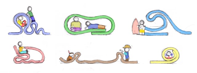 After the children have finished playing,and have gone to sleep, the foam slowly begins to move. When the children awake the next morning, they find that it has repositioned itself into its original squiggle.